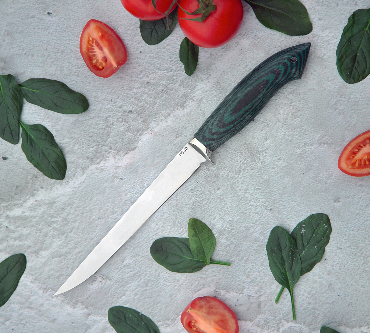 Филейный нож из нержавеющей стали VG-10, рукоять - микарта, кожаный чехол в комплекте